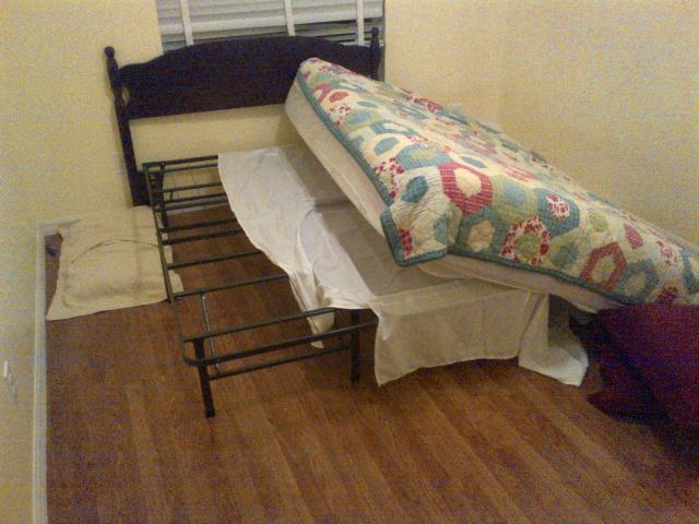 Finally, look what Gracie did last night!  She was being a little mischievous.  The mattress is quite heavy, so it gives some indication how strong Gracie is.  No worries yet about her destroying this bed.  Just don’t want her to hurt herself.  I may have to come up with a way to keep her from separating the mattress from the frame.
